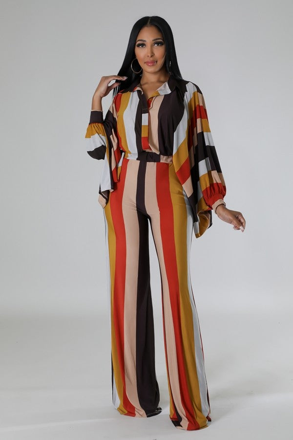 Stretch pants set, Collar, Long sleeve, No closure, High-waisted pants, Elastic waistband, Wide-leg. The model is wearing a small.