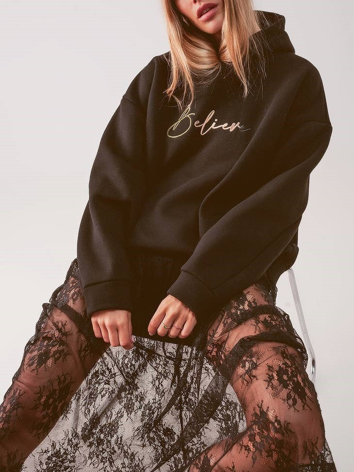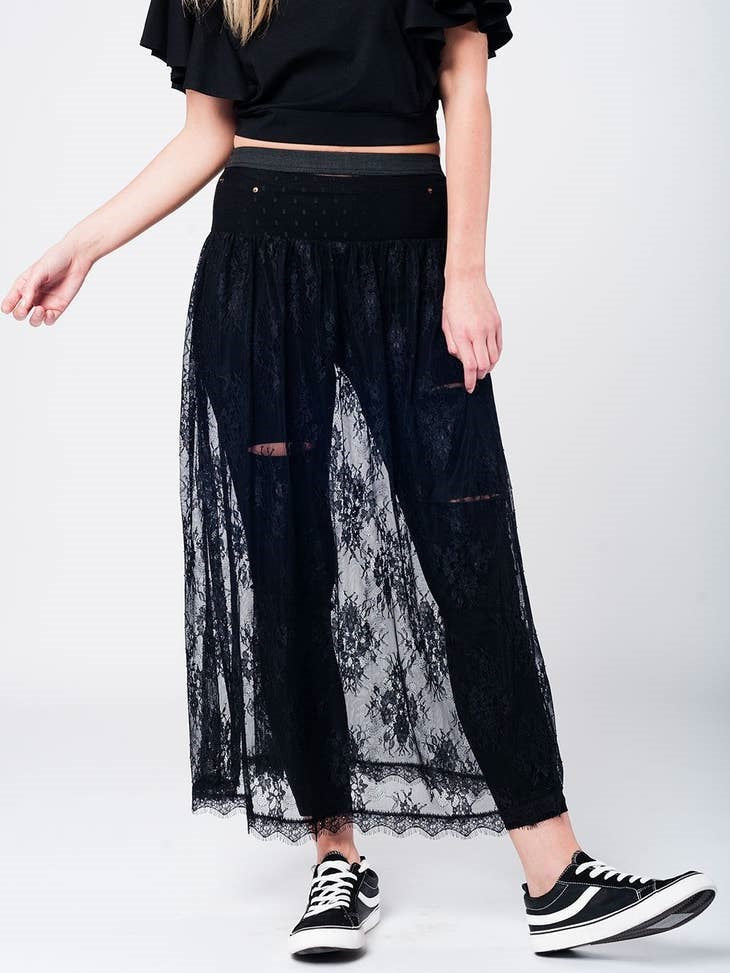 Black lace skirt with elastic waistband and side zip